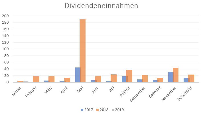 Es ist das erste Mal nach knapp zwei Jahren, in denen ich nun schon Dividenden erhalte, dass ich eine negative Veränderung zum Vorjahr habe. Hier sieht man, dass es sich lohnt jeden Monat mehrere Unternehmen zu besitzen, die Dividende ausschütten, denn sonst kann eine Kürzung, wie bei mir bei General Electric, zu einen Unterschied zum Vorjahr von fast -50 % führen. Der nächste Monat wird aber vorraussichtlich deutlich besser laufen.