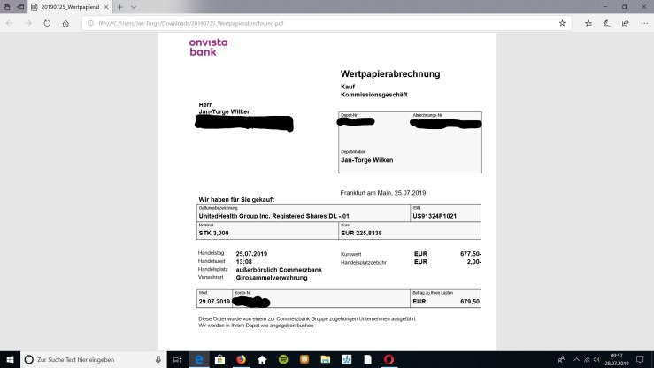 Den Kauf von UniedHealth Group habe ich beim Onvista-Depot getätigt, somit waren die Kosten für den Kauf sehr gering, hier einmal die Abrechnung: