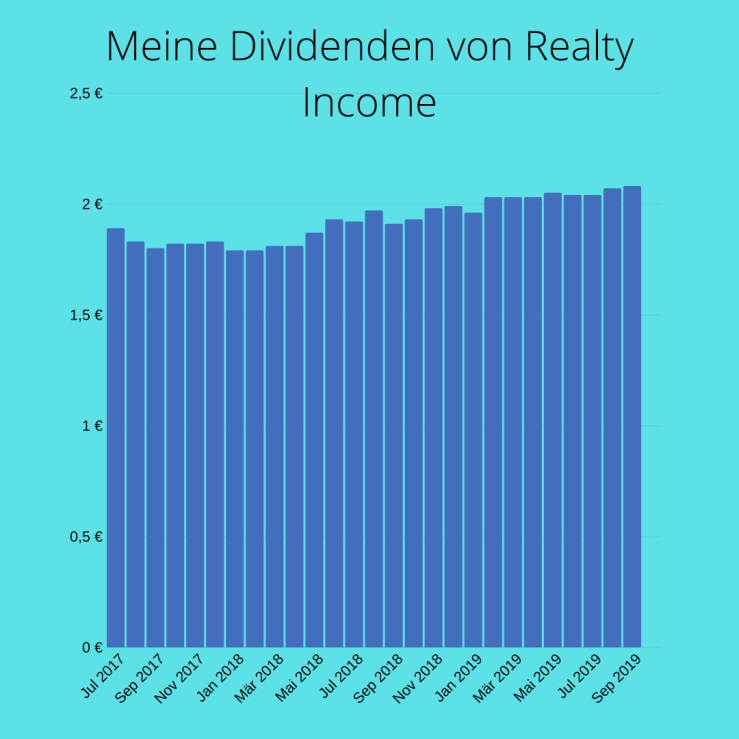 Die Dividendensteigerung von Realty Income macht einfach Spaß, die Dividende wird fast jeden Monat ein kleines bischen höher. Wer also Motivation beim Investieren braucht, dem kann ich Realty Income nur empfehlen. Hier sind zwar keine krassen Kursgewinne zu erwarten, aber die Konstanz der Dividende gibt einem ein sicheres Gefühl. Hierzu meine Grafik der erhaltenen Dividenden von Realty Income: