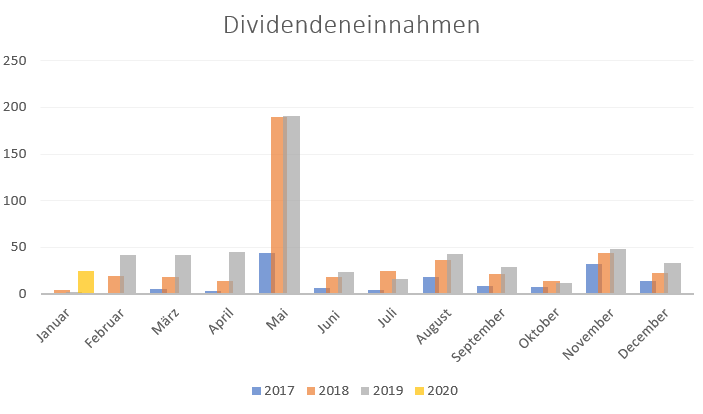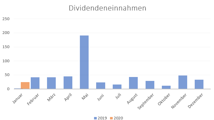 Ich möchte jetzt bei den Monatsübersichten auch immer auf den „selben“ Monat im vorherigen Quartal schauen, um hier zu sehen wie sich die Dividenden entwickelt haben. Schauen wir uns das mal für den Januar an, wir vergleichen den Januar 2020 mit dem Oktober 2019.