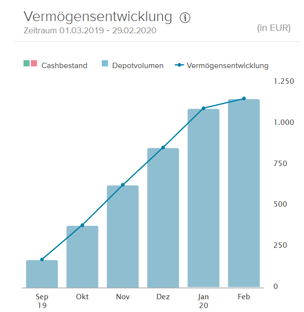 Im Februar hat mein Depot 167,71 € an Kursverlusten hinnehmen müssen. Damit liegt das Depot zum 29.02.2020 mit 148,50 € im Minus.