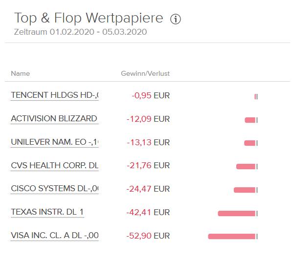 Somit konnte sich auch mein Consors-Sparplan Depot dem Kursrutsch an den Börsen nicht entziehen. Dies wird vor allem an dem folgenden Bild sichtbar, schauen wir uns mal die Top und Flop Unternehmen aus dem Monat Februar an.