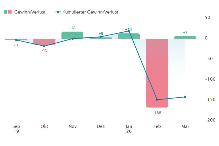 Im März ist mein Depot um 6,92 € gestiegen. Damit liegt mein Depot nun mit 141,57 € im Minus.