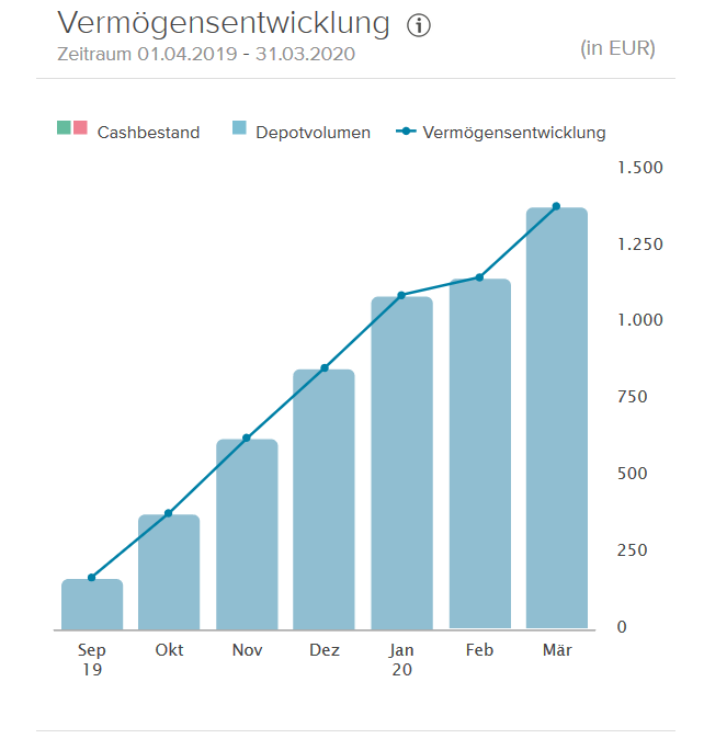 An dieser Grafik sieht man sehr schön, wie in diesem Monat die Aktienkäufe auch bei der Vermögensentwicklung wieder zu erkennen sind. Das war im Februar nicht der Fall. Der aktuelle Vermögenswert in diesem Depot liegt bei 1.383,78 €. Ich hoffe, im nächsten Monat kann ich die 1.500 € knacken.