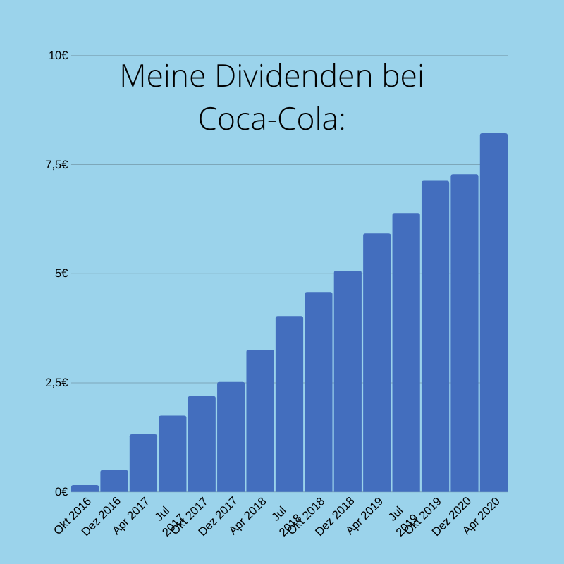 Coca-Cola hat die Dividende zuletzt um 2,5 % angehoben, das ist nicht viel, aber trotzdem zeigt Coca-Cola, dass sie anheben können. Ich freue mich schon darauf, wenn ich es schaffe, dass ich jedes Quartal mehr als 10 € Dividenden von Coca-Cola bekomme.