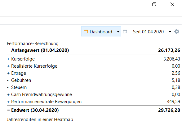 Allein im Monat April hat mein Depot Kurserfolge von 3.206,43 € verzeichnen können. Hier sieht man, wie die starken Kurserholungen der Indizes auch in meinem Depot angekommen sind. Mal sehen, wie es sich weiterhin entwickelt. Ich persönlich hoffe nochmal auf einen Rücksetzer, aber auch wenn es keinen gibt, freue ich mich mit so viel Kapital – nun sind es wieder über 29.000 € – investiert zu sein.