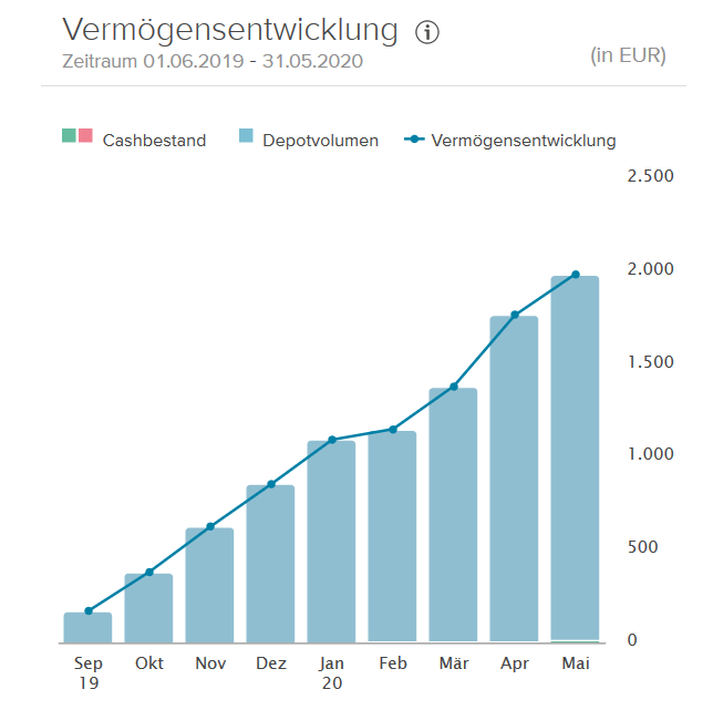 Auch an dieser Grafik sieht man, dass es weder eine Entwicklung gab wie vom Januar zum Februar, aber eben auch keine wie vom März zum April. Sondern, dass mein Vermögen ca. um die Summe meiner Einzahlungen gestiegen ist. Der aktuelle Vermögenstand beim Consorsbankdepot inklusive Dividenden liegt bei 1.988,28 €.