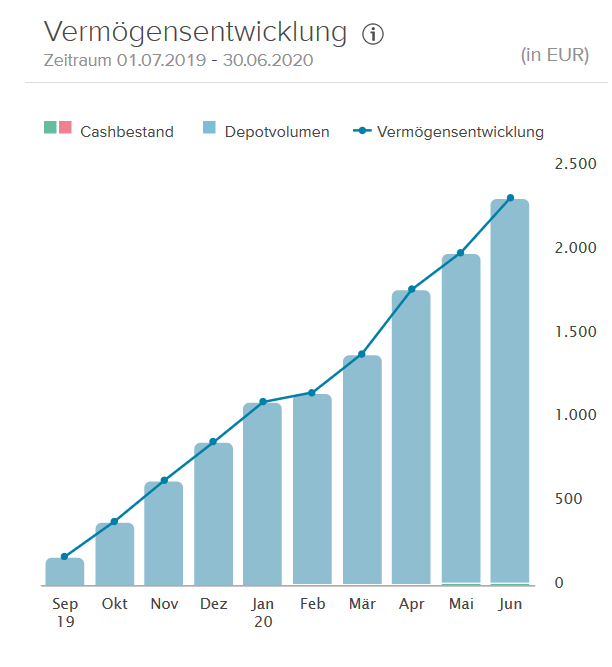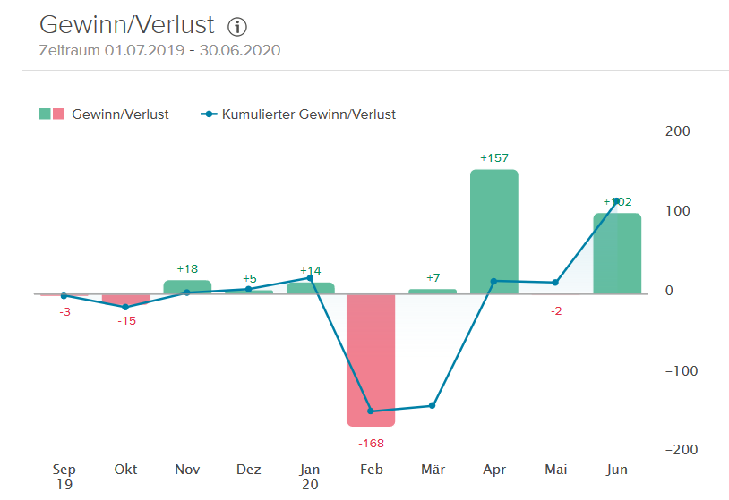 Im Juni ist mein Depot um 102,36 € gestiegen, somit liegt das Depot inklusive der Dividenden mit 115,34 € im Plus.