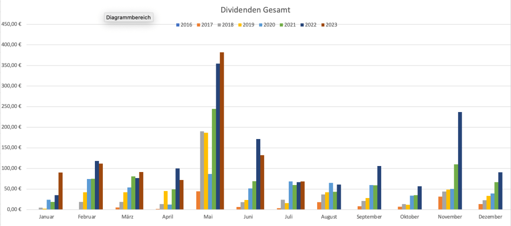 | 2019 | 2,36€ | 42,09€ | 41,88€ | 45,04€ | 190,80€ | 23,31€ | 15,89€ | 42,31€ | 11,44€ | 11,98€ | 48,65€ | 33,20€ |